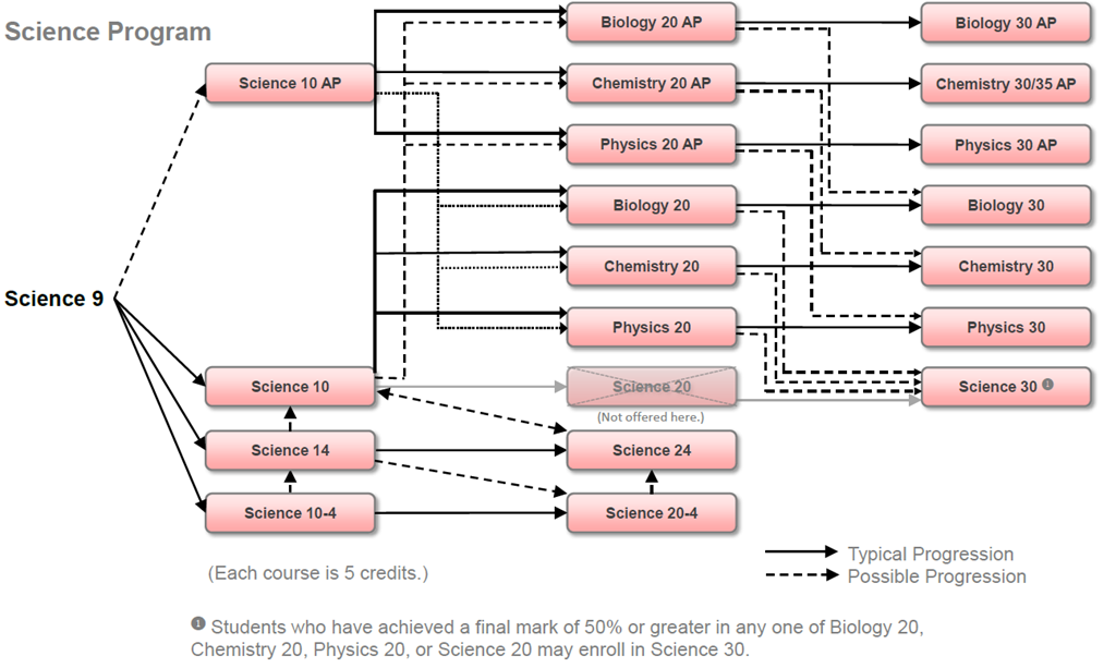 Students in Grade 10 are required by Alberta Education to complete Science 10 before taking Biology, Chemistry, or Physics at the 20 and 30 levels. The level of difficulty increases with higher numbered science courses. Students should carefully determine which science course(s) are needed for entrance to various post-secondary programs.